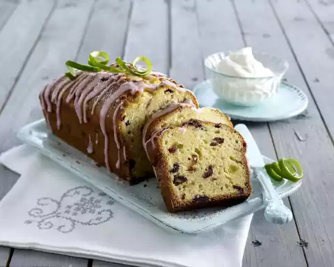 Remove the cake from the oven and after approx. 15 minutes turn out onto a cake rack. Mix liqueur and lime juice and sprinkle the cake with it. Let the cake cool down. Sieve the icing sugar into a bowl. Add cranberry juice and mix to a thick glaze. Spoon the icing in strips over the cold cake and let it dry for 1-1 1/2 hours. Decorate cake with lime peel spirals