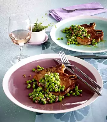 4 Cut the bacon into small cubes and fry it in a dry pan. Mix them with the peas and the rest of the butter into pieces. Serve them immediately with the pork chops.
