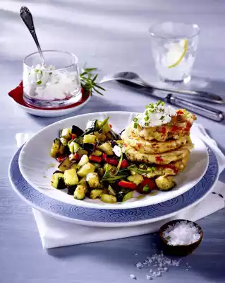 In the meantime, wash and clean the eggplant, peppers and courgettes and cut them into small cubes. Wash the rosemary, shake dry and tear. Heat the oil in a pan, fry the vegetables and rosemary, except for a little bit for garnishing, for about 8 minutes while turning, season with salt and pepper.