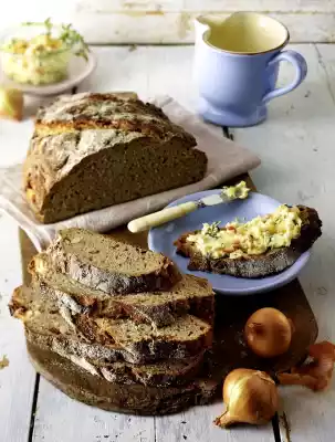 Knead the onion mixture into the dough. Form an oblong loaf of bread, possibly turning it in rye meal or flour. Sprinkle a baking tray with water. Place baking paper on top and sprinkle the baking paper with water as well.