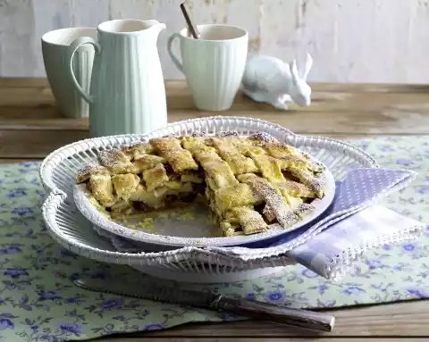 Mix with lemon juice, 75 g sugar, 40 g flour, almonds, cinnamon and raisins. Roll out half of the dough round (approx. 24 cm Ø) on a floured work surface. Line a mould with it, cut off any protruding edges. Sprinkle the base with breadcrumbs. Spread the apple mixture on top. Roll out the remaining dough on a floured work surface. Roll out strips (approx. 2 cm wide) with a wavy pastry wheel. Place a dough grid on the cake. Whisk 1 egg, brush the dough grid with it and sprinkle with 1 tablespoon of sugar. Bake in the preheated oven (electric cooker: 200 °C/ convection oven: 175 °C/ gas: level 3) on the lower rack for 30-40 minutes. Cover if necessary after half the baking time.