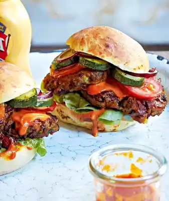 For the sauce mix tomato ketchup and salad cream. Season to taste with chilli powder. Cut the rolls in half horizontally and combine with the sauce, lettuce, burger patties, tomatoes, zucchini and onion rings to make burgers