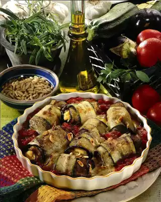Place a few slices of courgette and aubergine next to each other on the work surface so that they overlap at the edges. Sprinkle with salt and pepper. Put some mashed potatoes in the middle and roll up.