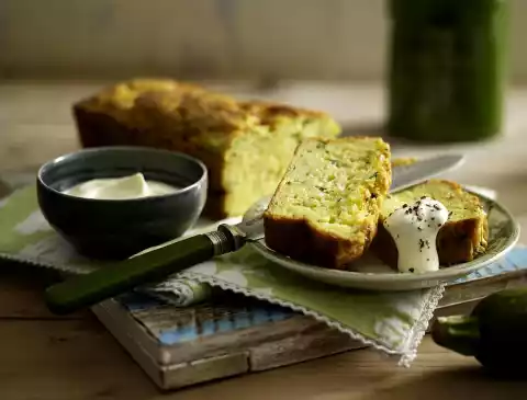 Preheat oven (electric cooker: 175°C/circulating air: 150°C/ gas: level 2). Mix eggs, crème fraîche and oil with the whisk of the hand mixer until creamy. Add flour, baking powder, approx. 2 tsp salt, approx. 1/2 tsp pepper, zucchini and cheese and sieve over the mixture.