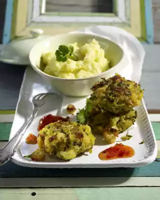 Drain the potatoes. Heat the milk and fat and add to the potatoes. Mash everything. Arrange the mashed potatoes and zucchini-corn pancakes. Garnish with parsley. Serve with sweet and hot Asian chili sauce.