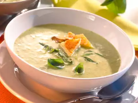 Fry the chunks of bread and garlic until golden brown. Season the zucchini cream soup again and serve with the croutons. Serve garnished with the remaining basil.