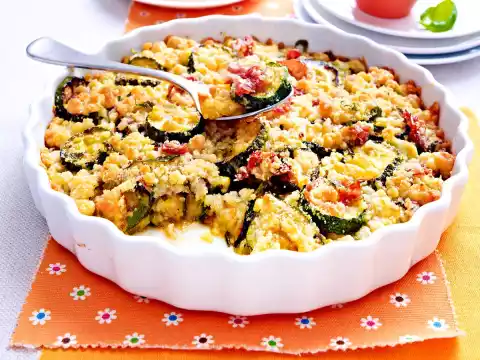 Put the zucchini and ham in an ovenproof dish and cover with the crumbled mixture. Sprinkle breadcrumbs over it. Bake in the preheated oven (electric cooker: 200 °C/ convection oven: 175 °C/ gas: level 3) for about 15 minutes until the crumbles are golden. Serve hot