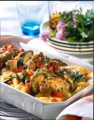 Fry the zucchini in the cooking fat for 3-4 minutes. Season with salt and pepper. Deglaze with stock and cream and bring to the boil. Thicken with sauce thickener and season with salt and pepper. Add minced meat and heat up again.