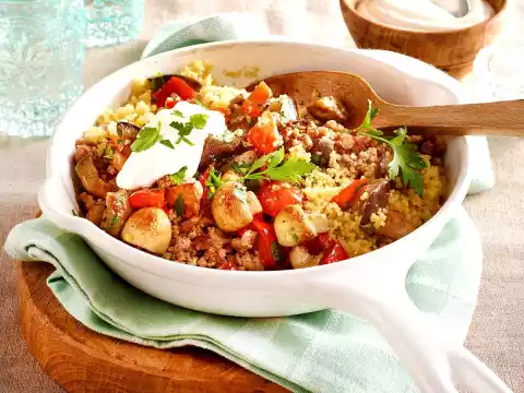 Loosen the couscous with a fork, add it to the vegetables in the pan with minced meat and parsley, heat it up briefly and season with salt, pepper and cumin. Garnish couscous mince pan with parsley and add yoghurt.