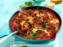 Halve the peppers, clean, wash and cut into small pieces. Clean, clean and quarter the mushrooms. Wash, clean and dice the aubergine. Wash parsley, shake dry and chop coarsely, except for a few leaves for garnishing.