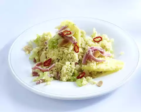 Peel and halve the pineapple, cut out the woody stalk and cut the fruit into thin slices. Wash and clean the chilli and cut into fine rings. Add almonds, pineapple and ham to the couscous and arrange on plates.