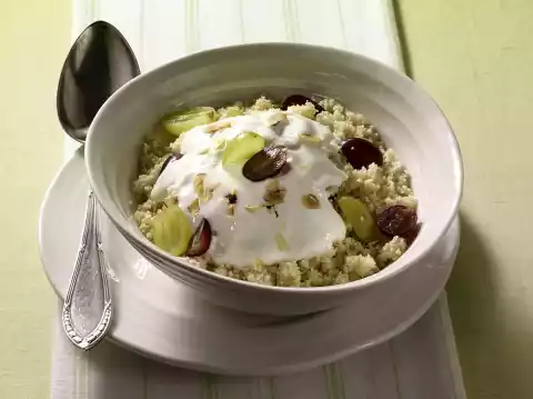 Prepare the couscous in boiling water with 1 pinch of salt according to the instructions on the packet and leave to cool. Wash the grapes, dab dry and cut in half. Mix 60 g grapes and 5 g hazelnut leaves with the cooled couscous and pour into a bowl. Mix yoghurt with sugar, pour over the couscous muesli and decorate with remaining grapes and almond flakes