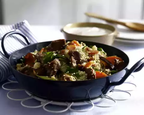 Heat the oil in a pan. Fry the meat, zucchini, eggplant and carrot for about 5 minutes. Rinse raisins. Loosen the couscous with a fork. Add the raisins and couscous to the pan.