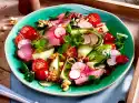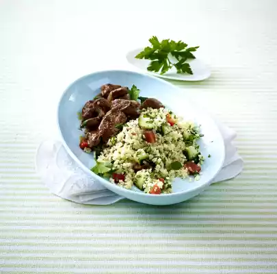 Mix couscous, paprika, vinegar, cucumber and parsley strips and season to taste with salt, pepper and cumin.