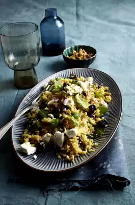 Bring 250 ml water, saffron threads, cumin, cinnamon, cayenne pepper and 1/2 teaspoon salt to the boil in a covered pot. Remove from the heat, stir in the couscous and let it swell covered for about 5 minutes.