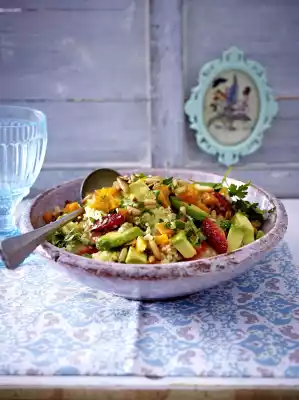 Wash the parsley, shake dry. Pluck off leaves and chop finely, except for something to garnish. Wash, clean and chop the strawberries. Halve avocado and remove core. Remove the flesh from the skin and chop finely.