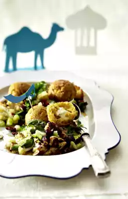 Puree chickpeas, onion, garlic, chopped parsley, chilli and egg yolks. Mix in breadcrumbs and flour, season to taste with salt, pepper and cumin. With moistened hands form approx. 16 flat cakes. Place a piece of feta cheese on each of them and form balls out of it