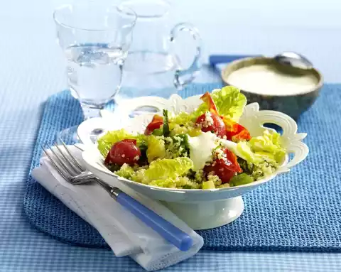 Clean and wash the romaine lettuce, pluck the leaves and let them drain. Fold lemon juice, tomatoes with oil and romaine lettuce into the couscous. Season the salad with salt and pepper and place in a bowl. Mix quark, curcuma and 1 teaspoon curry and season to taste with salt, pepper and sugar. Serve dip with the salad