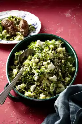 Clean and wash the salad and cut into fine strips. Peel garlic and chop finely. Mix lemon juice, salt, pepper and sugar well. Fold in 5 tablespoons of oil. Mix couscous, cucumber, herbs, pistachios and salad.