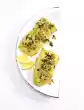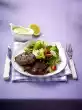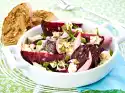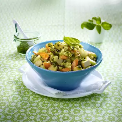 Spread a thin layer of oil on a coated pan and fry everything for about 6 minutes. Add the pesto and mix with the couscous. Arrange in a small bowl and garnish with a basil leaf