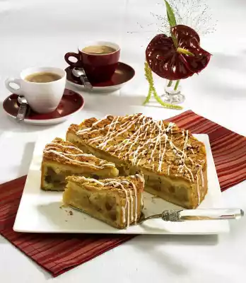 Mix flour and baking powder. Add 120 g sugar, egg, 250 g butter and 2 tablespoons cold water and knead. Divide dough into 3 portions. Put 2 portions in a cold place. Grease the bottom of a springform pan (26 cm Ø). Roll out 1 portion of dough on a floured work surface to a circle the size of a springform pan, place it on the bottom of the pan, prick several times with a fork, close the pan. Bake the dough base in a preheated oven (electric range: 200 °C/ convection oven: 175 °C/ gas: level 3) for approx. 10 minutes. Let cool down a little. Roll out the second portion of dough to a strip (approx. 4 x 75 cm), roll it up and place it in the springform pan. Roll out the dough, press lightly on the edge of the tin and the pre-baked base. Pour in the apple mixture and smooth it down. Place the protruding edge of the dough over the filling. Roll out the remaining portion of dough to the size of a springform pan, prick several times with a fork and place it on the filling as a lid. Bake in the preheated oven (electric cooker: 175 °C/ convection oven: 150 °C/ gas: level 2) for approx. 45 minutes