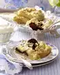 In the meantime, peel, quarter, core and cut apples into pieces. Mix with juice from 1 lemon. Bring 350 ml apple juice, quince jelly, 100 g sugar and rum flavouring to the boil. Add apple pieces and simmer covered for about 5 minutes.