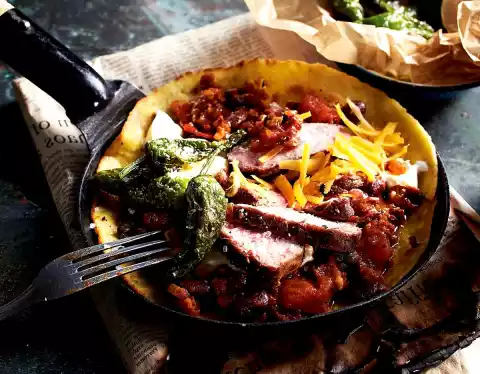 Season the bean mix vigorously with salt, pepper and cayenne pepper. Then crush them with a fork, sometimes slightly. Take the steaks out of the oven for about 1 minute, then cut them into strips. Arrange tortillas with the bean mix, steak strips, sour cream, pimientos and cheese.