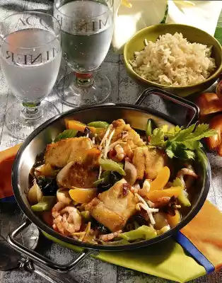 Add rungs. Pour on 300 ml water and apricot juice, stir in Fix for China pan and braise at low heat for about 10 minutes. Finally, carefully fold in the prawns and fish cubes and heat up as well.