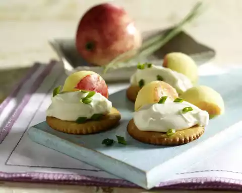 Use two teaspoons to cut off the cams from the cream cheese and place them on the crackers. Garnish with apple balls and chives.
