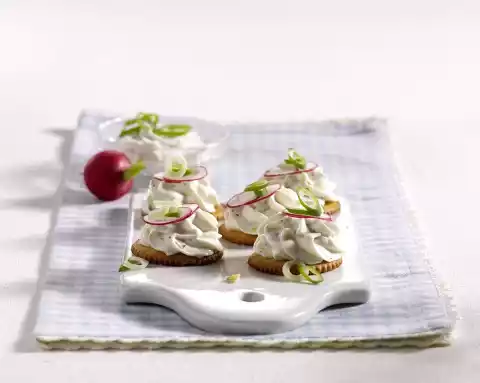 Mix cream cheese and chopped spring onion and fill into a piping bag with a large star-shaped spout. Spray cream onto 5 crackers and garnish with radish slices and spring onion rings.