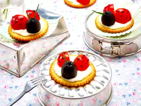 Wash the tomatoes, drain well and cut into quarters. Drain the olives, cut off about 1/4 on the long side. Spread the crackers with cream cheese. Put 2 cherry tomato quarters and an olive as ladybird on each cookie.