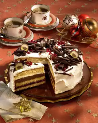 Place the second cake base on top. Whip the nougat cream with the whisk of the hand mixer until creamy. Pour on the bottom cake layer and smooth it down. Mix the cream firmer and 1 packet of vanilla sugar. Whip 250 g cream until stiff and allow the sugar mixture to trickle in. Spread on the nougat cream and carefully smooth it down. Place the top layer on top. Chill for about 2 hours. Chop 100 g couverture, melt carefully over a warm water bath. Place on a marble or porcelain board and spread thinly. Place in a cold place and allow to set. When the chocolate has just set, remove the chocolate with a spatula and chill. Whip 250 g cream until stiff. Remove the cake from the ring and spread with the cream. Decorate cake with chocolate rolls, halved Mozartkugeln and cranberries