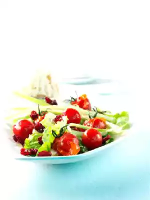 Rinse lettuce and spin dry. Mix cherry tomatoes, celery, spring onions and cranberries and arrange on the leaf salad. Drizzle the marinade over it. Serve with baguette.