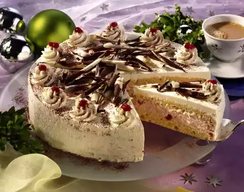 Whip 500 g cream and 50 g sugar until stiff. Finally, pour in the cream thickener. Fold the cranberries into the cream, using only 1 tablespoon. Cut the base once crosswise and place a cake ring around the lower base. Spread the cranberry cream on top and cover with the second cake base. Whip 300 g cream until stiff. Spread 2/3 of the cream all around the cake, fill the rest of the cream into a piping bag with a star-shaped spout and squirt it onto the cake as dots. decorate the cake with chocolate rolls, 1 tablespoon cranberries and cocoa