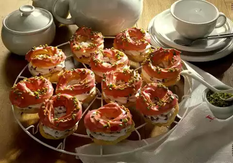 Drain the cranberries well on a sieve (collect the juice), fold the berries into the cream, refrigerate. Mix icing sugar with some cranberry juice to a glaze, spread it on the tops of the wreaths and sprinkle with pistachios.