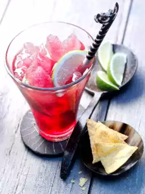 Put the ice cubes in a freezer bag and crush them coarsely. Put the crushed cranberry ice and lime wedges into well-chilled long drink glasses and top up with the ice tea. Serve immediately.