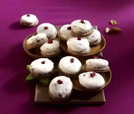 Finely chop the cranberries and set aside approx. 1 tbsp for decorating. Beat the egg whites and 1 pinch of salt with the whisk of the hand mixer until very stiff. Gradually add sugar to the mixture to make it shiny and firm. Mix almonds, starch, 85 g icing sugar and cranberries and fold into the beaten egg white. Pour the macaroon mixture into a piping bag with a perforated spout (approx. 1 cm Ø), squirt a dab onto each cookie. Decorate each cookie with 1 piece of cranberry. Reduce oven temperature (electric cooker: 150 °C/ circulating air: 125 °C/ gas: level 1). Bake the biscuits one after the other for another approx. 10 minutes