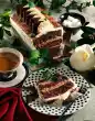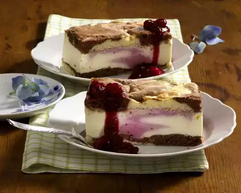 Fold the sieved cocoa into the rest of the mixture and place it between the light-coloured sponge cake blobs. Pull carefully through the masses with a spoon handle and smooth the surface slightly. Bake the sponge cake in a preheated oven (electric cooker: 200 °C/ convection oven: 175 °C/ gas: level 3) for 8-10 minutes. Turn the sponge onto a damp tea towel, remove the paper and let the sponge cool down. Simmer cranberries, 3 tablespoons of water and 80 g sugar for 3-4 minutes. Soak 3 sheets and 1 sheet of gelatine separately in cold water. Mix mascarpone, quark, vanillin sugar, lemon juice and 50 g sugar. Remove about half of the cranberries (approx. 150 g), puree the remaining cranberries. Squeeze out 1 sheet of gelatine, stir into the cranberry puree and chill for about 30 minutes (puree must have cooled down, but not yet firm). Squeeze 3 sheets of gelatine and dissolve. Stir in 3 tablespoons of mascarpone cream, then stir into the remaining mascarpone cream. Whip cream until stiff and fold into the cream.
