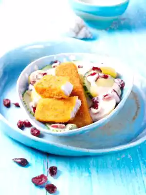 Mix salad mayonnaise with lemon juice and ketchup, season with salt and pepper and fold into the potatoes. Rinse the cucumber, peel it in strips and cut it into slices. Dab the cucumber slices dry and mix into the potatoes together with the cranberries.