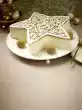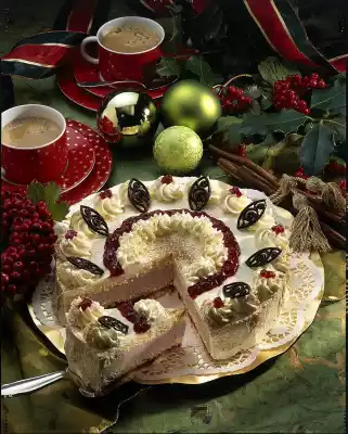 Whip the rest of the cream and sugar until stiff and place a good 1/3 in a piping bag with star-shaped spout. Remove the cake from the cake ring and spread the remaining cream all around. Decorate with cream tuffs, remaining cranberries and chocolate decoration.