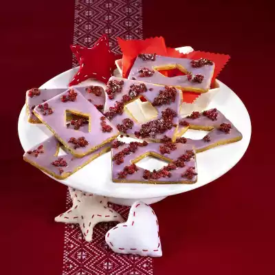 Take out and let cool down. Mix icing sugar, 2-3 tablespoons of water and a few dashes of blue and red food colouring to a purple icing. Carefully spread the icing over the cookies. Finely chop the cranberries and decorate the cookies with them. Let the icing dry. Sprinkle cranberries with sugar if necessary