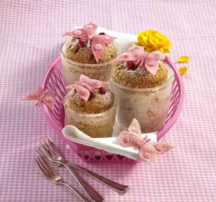 Mix flour, starch, almonds and baking powder and quickly stir into the fat-egg mixture. Coarsely chop 100 g cranberries and add. Fill the dough into the glasses, leaving 1.5 cm of rim free. Bake the cake in a preheated oven (electric cooker: 175 °C/ convection oven 150 °C/ gas: level 2) for approx. 25 minutes. Bake the big glasses for another 10 minutes. Take out the cake and let it cool down. Halve 50 g marzipan. Colour with red food colouring in different shades of red and roll out to a thickness of about 3 mm. Cut out butterflies, decorate with remaining marzipan and dry on a plate sprinkled with sugar.