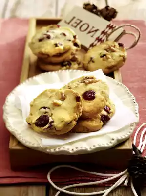 Roughly chop the nuts. Cream butter, sugar, vanilla sugar and 1 pinch of salt. Stir in egg. Mix flour and baking powder, stir in portions briefly. Fold in nuts and cranberries.