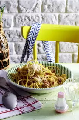 Fold the noodles and 4-5 tablespoons of noodle water into the egg-bacon mix. This works best with a fork. Mix everything thoroughly and quickly. Serve. Because more cheese is simply the best: grate the rest of the Parmesan cheese and sprinkle it over the spaghetti together with coarse pepper.