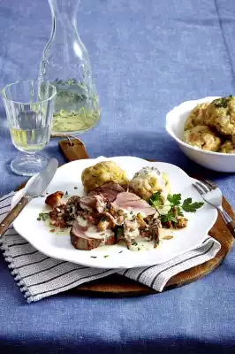 Arrange meat, dumplings and chanterelles on plates, sprinkle with the remaining parsley. Garnish with parsley leaves.