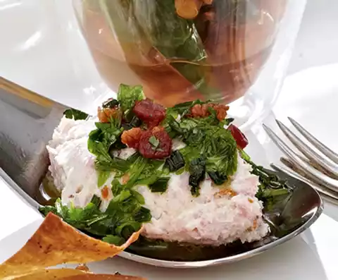 Wash herbs. Cut chives into small rolls. Finely chop parsley and chervil. Mix herbs, remaining bacon mixture and 4 tbsp. oil. Season with pepper. Form about 30 dumplings from the cream cheese mixture with two teaspoons.