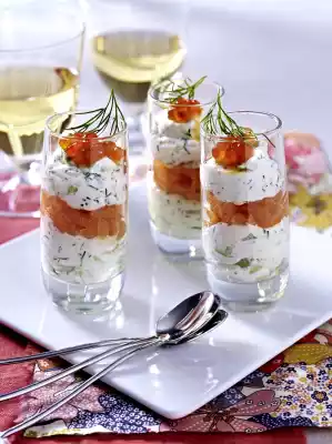 Mix cream cheese, sour cream, lime juice and zest. Season with salt and pepper. Stir in dill and cucumber. Cut salmon into fine strips. Layer cream cheese cream and salmon in glasses. Garnish with one teaspoon each of trout caviar and dill flags