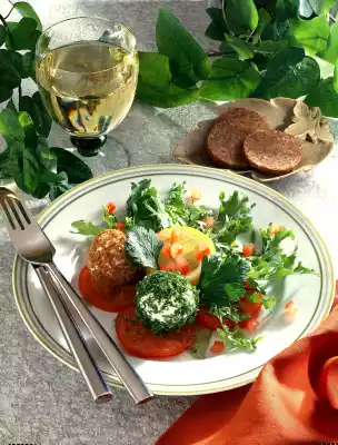 Form cream cheese into balls, roll them alternately in parsley and pumpernickel and arrange them on the salad. Serve garnished with lemon and parsley leaves.