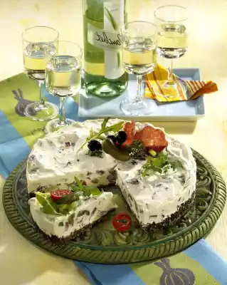 Fold in spring onions, gherkins and salami. Whip the cream until stiff, allow the cream firmer to trickle in. Fold the cream into the cream cheese, season to taste with salt and pepper. Spread the cream cheese cream on the base and spread. Chill for about 2 hours. Remove the cake from the tin. Garnish with slices of salami, cucumber, olives, tomatoes, parsley, rocket and lettuce leaves. Add pumpernickel bread