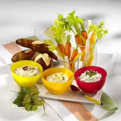 Cut diagonally into narrow rings. Stir bacon, except for a teaspoon for garnishing, herbs and spring onion into the base cream. Garnish dip with remaining bacon cubes.